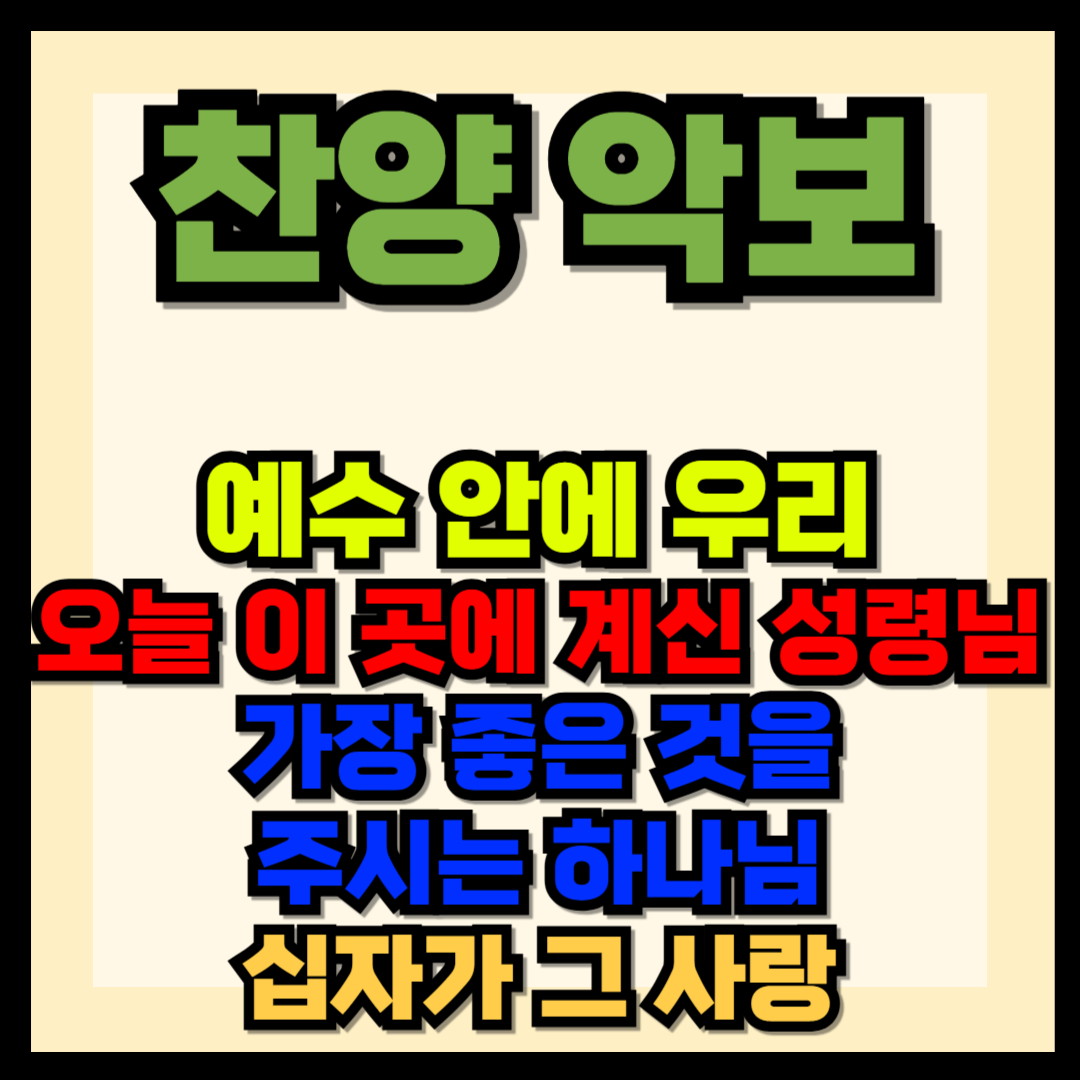 예수 안에 우리, 오늘 이곳에 계신 성령님, 가장 좋은 것을 주시는 하나님, 십자가 그 사랑 악보를 올려 드립니다. 악보통으로 가시면 최신 악보들을 구하실 수가 있겠습니다. 혹시나 급하신 분들을 위하여 구할 수 있는 곳들을 알려드립니다. 또한 각 찬양들의 PPT 파일을 올려드립니다. 급할 때 사용하실 수 있게 간단하게 만들어져 있으니 상황에 맞게 바꾸셔도 되겠습니다.