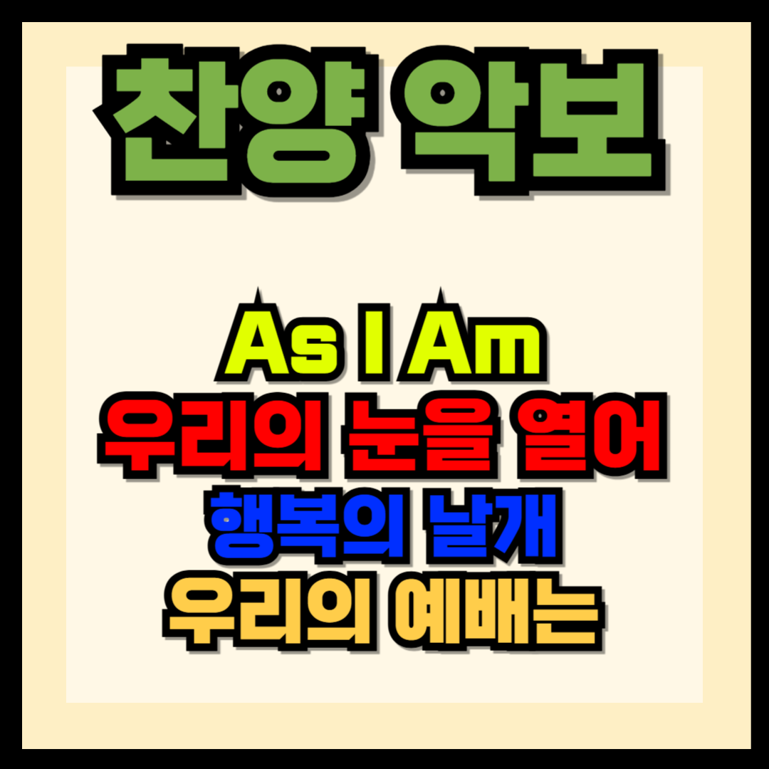 As I Am, 우리의 눈을 열어, 행복의 날개, 우리의 예배는 악보를 올려 드립니다. 악보통으로 가시면 최신 악보들을 구하실 수가 있겠습니다. 혹시나 급하신 분들을 위하여 구할 수 있는 곳들을 알려드립니다. 또한 각 찬양들의 PPT 파일을 올려드립니다. 급할 때 사용하실 수 있게 간단하게 만들어져 있으니 상황에 맞게 바꾸셔도 되겠습니다.